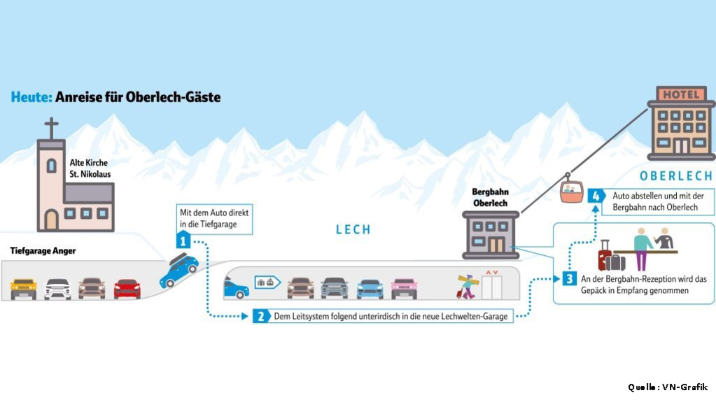 Die Tiefgarage Bergbahn Oberlech/Lechwelten wird über die Einfahrt der Tiefgarage Anger erreicht. In der Tiefgarage Anger ist ein Leitsystem zur Tiefgarage Bergbahn Oberlech/Lechwelten installiert.
