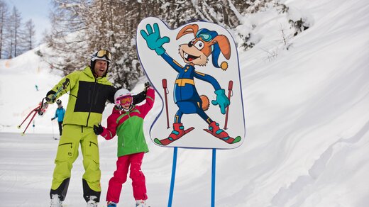 Auf dem Hopplweg geht’s tierisch zu! Denn auf der kindgerechten Skiabfahrt vom Gampen nach Nasserein trifft man nicht nur den lustigen Hasen Hoppl, sondern auch viele weitere Waldtiere.