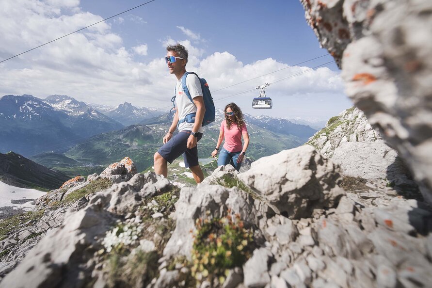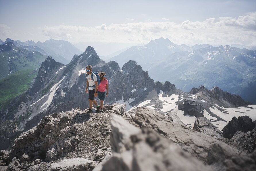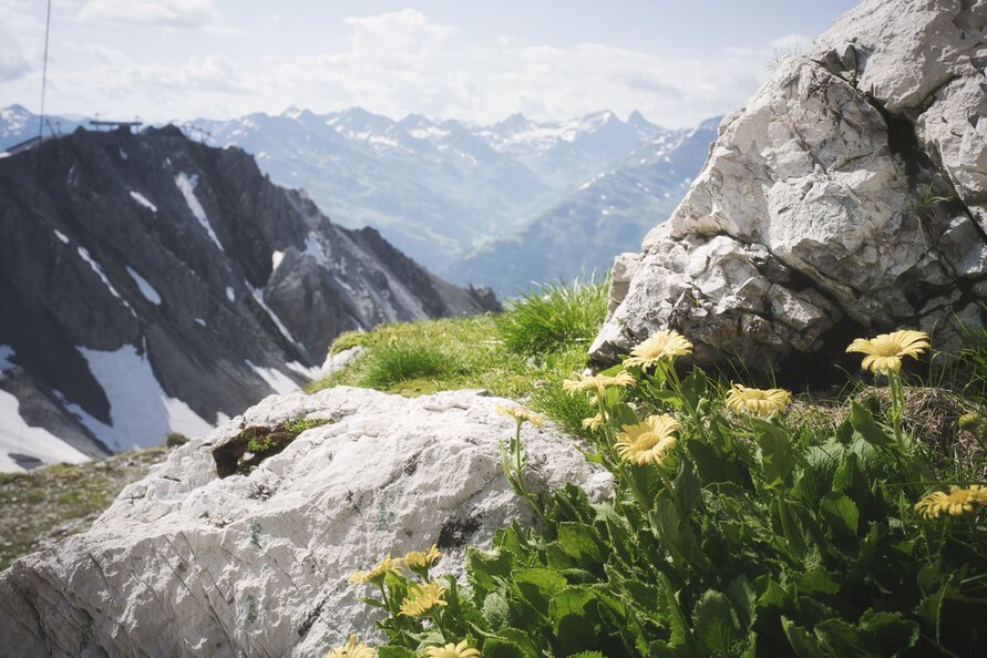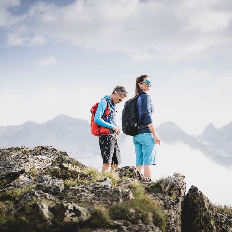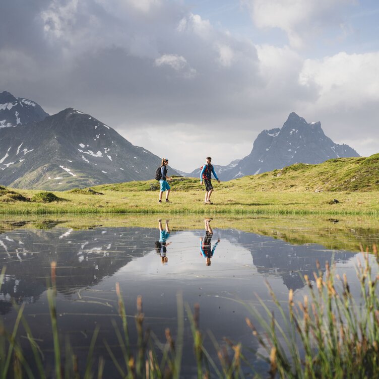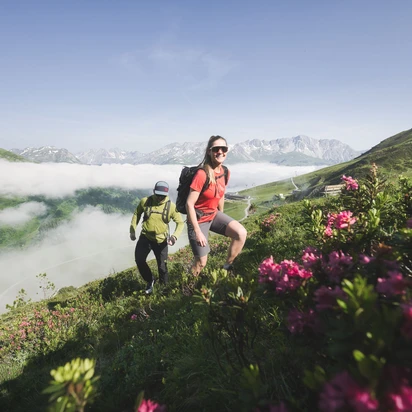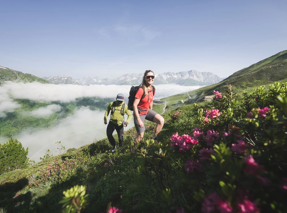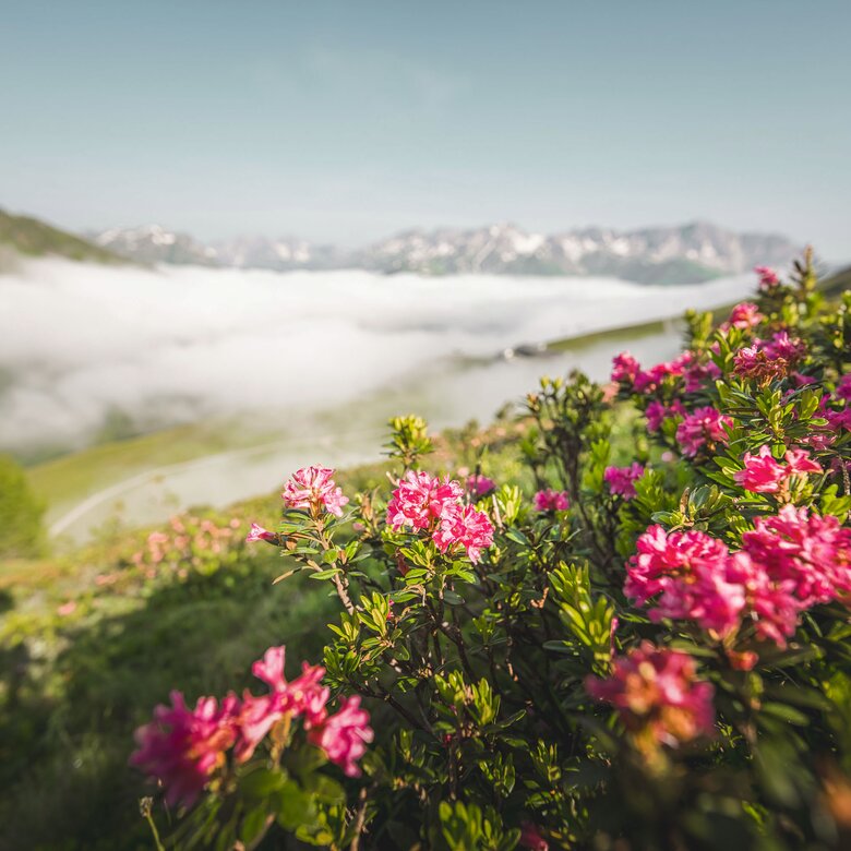 Wenn am Rendl im Juli die Alpenrosen blühen, bietet der Berg ein überwältigendes Farbenspiel. Der Alpenrosenweg führt durch ein Meer aus leuchtenden Heidekrautgewächsen. Fast so, als würde der Berg selbst in Rot erstrahlen. Auf rund 2.100 Metern eröffnet sich dabei ein beeindruckender Panoramablick über das Stanzer Tal.