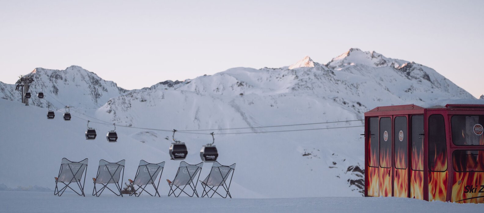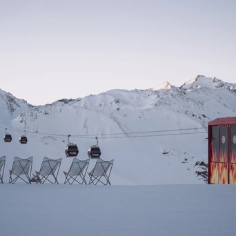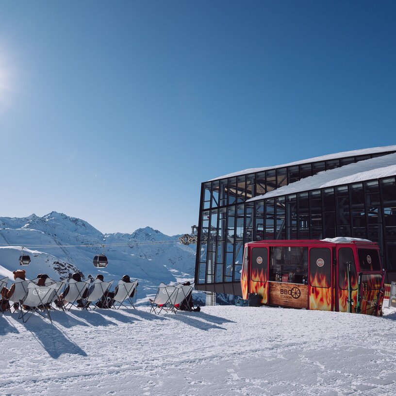 The perfect break in the middle of your ski day. Located outdoors at the Trittkopf middle station, surrounded by stunning alpine scenery. Sunshine, lounge chairs and a relaxed mountain vibe.