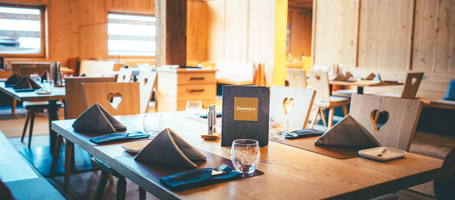 The Himmeleck table-service restaurant is distinguished by its exterior of reclaimed wood, shingles and glass, while inside it exudes warm Tirolean cosiness. Valentino Schwarz and his team serve traditional regional dishes, complemented by a wide selection of mainly Austrian wines, either in the welcoming indoor parlours or on the splendid sun terrace when the weather is fine. True to Tirolean tradition, a heavenly sweet treat to finish your meal is not to be missed. Enjoy peace, great food and genuine hospitality – be sure to book your table in advance.